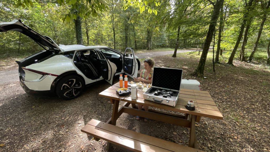 Deze keer voor het eerst eens gebruik gemaakt van het feit dat onze auto een 220 Volt aansluiting heeft. Niet om te laden, maar om te gebruiken. Stoppen langs de autoroute bij een picknick tafel, thee koken, espresso zetten. Leven als God in Frankrijk.
